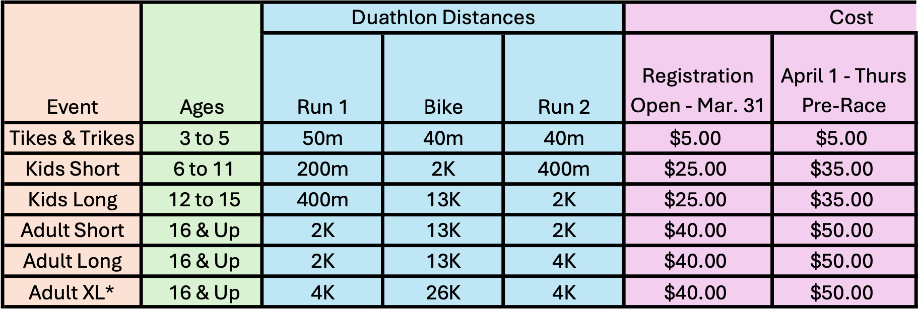 Race options are listed below, with plenty of distances on offer for both Triathlon and Duathlon racing. Athlete age is determined as of December 31st, 2025. Athletes may race in shorter divisions (younger age groups) if they’d prefer.